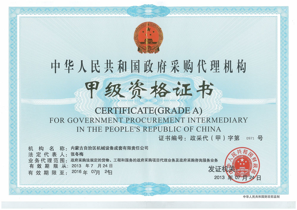 政府采購代理機(jī)構(gòu)甲級資格證書